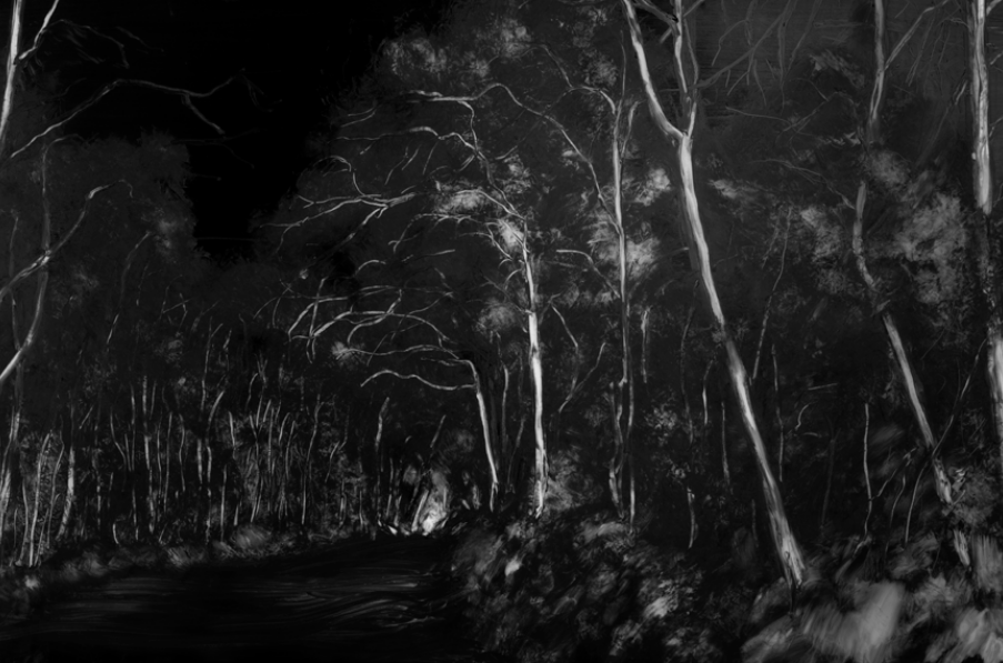 Created through a process of material removal and reversal of light and shadow contrasts, these paintings explore the ambiguity of how we perceive the forest: both as a place of mystery and danger – echoing the stories and legends of our childhood – and as a complex, fragile ecosystem, now recognised as a site of resilience in nature and essential to our survival.