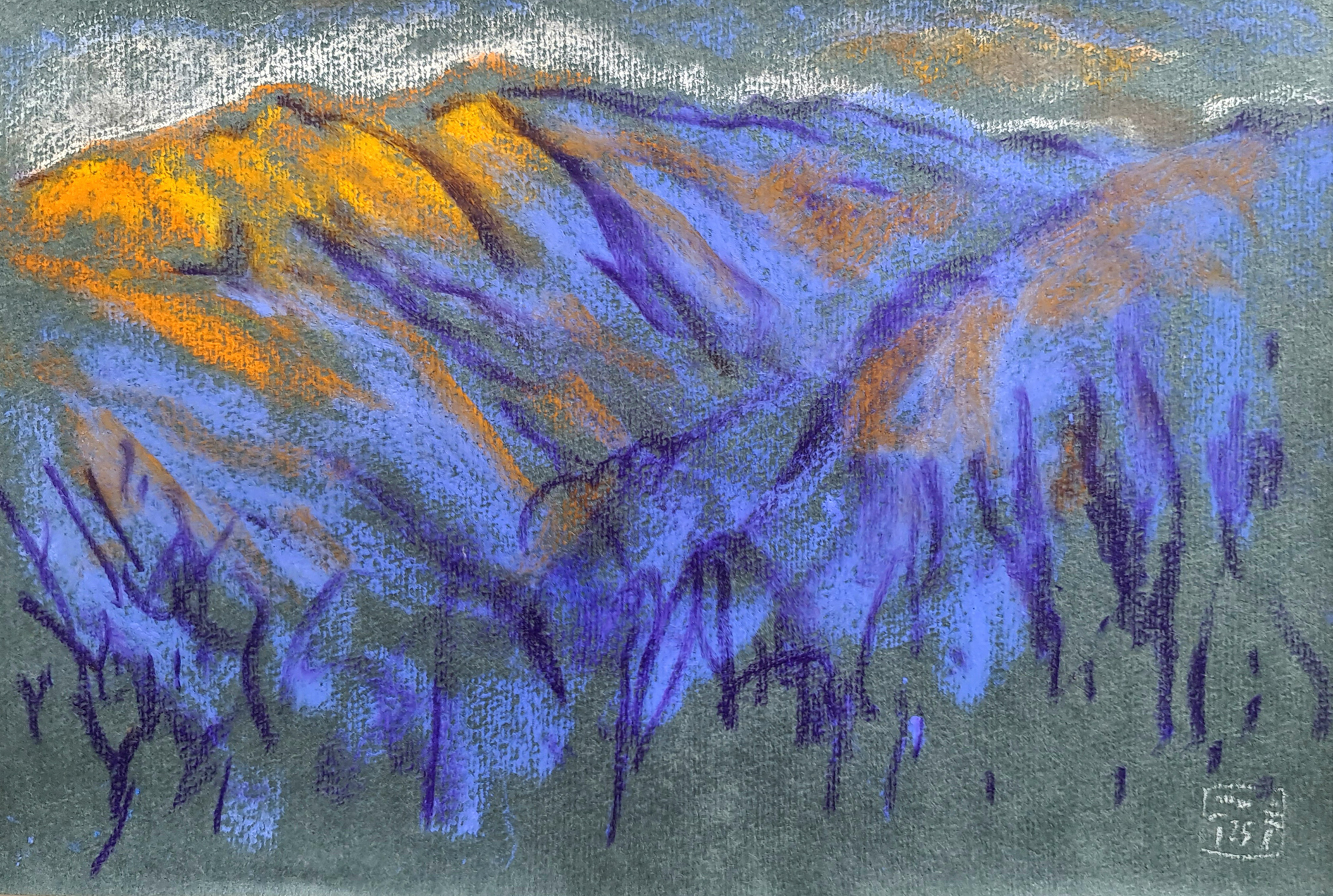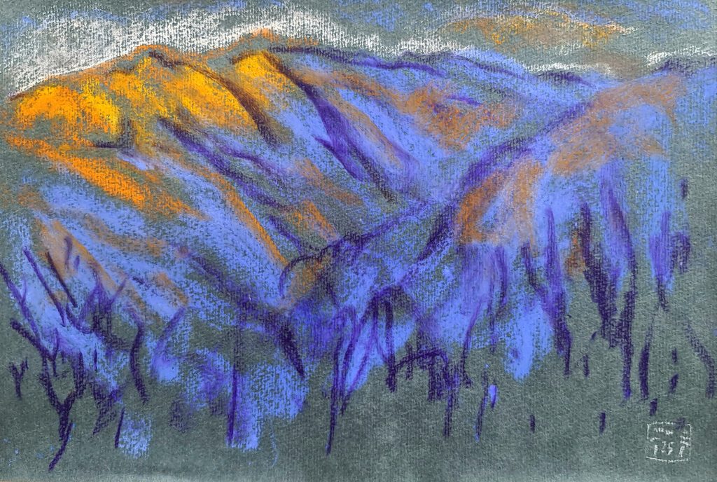 Blaue Berge bei Thirunelly, 2025, Kreide auf getöntem Papier, 17,5 x 25,5 cm
